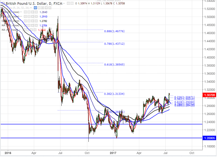 - Cable has broken major resistance around 1.30475 made on May 18th 2017 after weaker than expected U.S economic data. The pair jumped till 1.31138 on Friday and is currently trading around 1.30713.