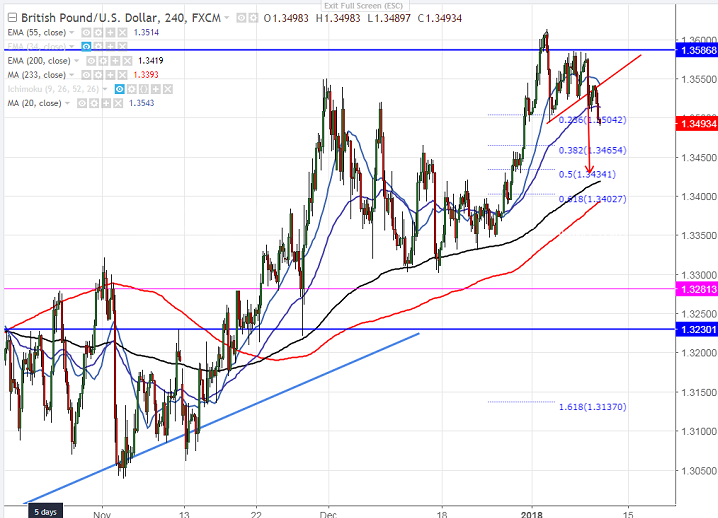 - On the lower side, near term support is around 1.3490 (Jan 3rd 2018 low) and any break below will drag the pair to next level till 1.3430/1.34020 (61.8% retracement). Short term bullish invalidation only below 1.3330.