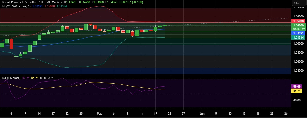 • Immediate resistance is located at 1.3469( 23.6%fib), any close above will push the pair towards 1.3512( Higher BB)