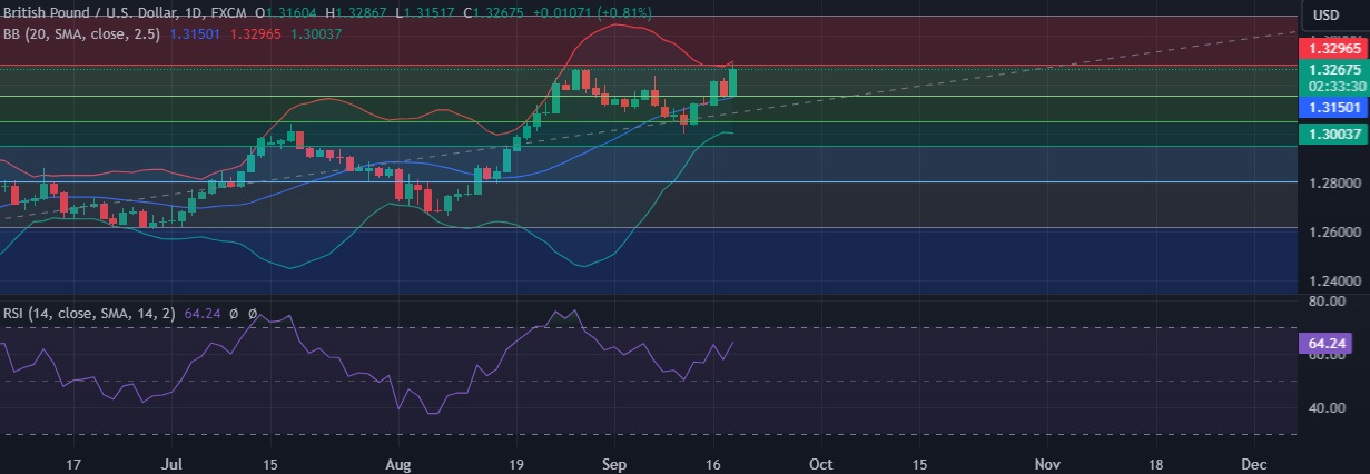 • At GMT 18:23, the pair was trading up0.82% at 1.3270, highest level 27th August.