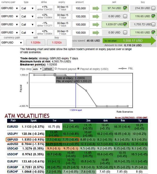 Since the cable's implied volatility is still perceived to be comparatively minimal within next one month time frame from other major G7 pairs (at around 7-8%), so here comes a multiple leg of option strategy for regular traders of this currency cross when there is little IV. A total of 4 legs are involved in the condor options strategy and a net debit is required to establish the position.