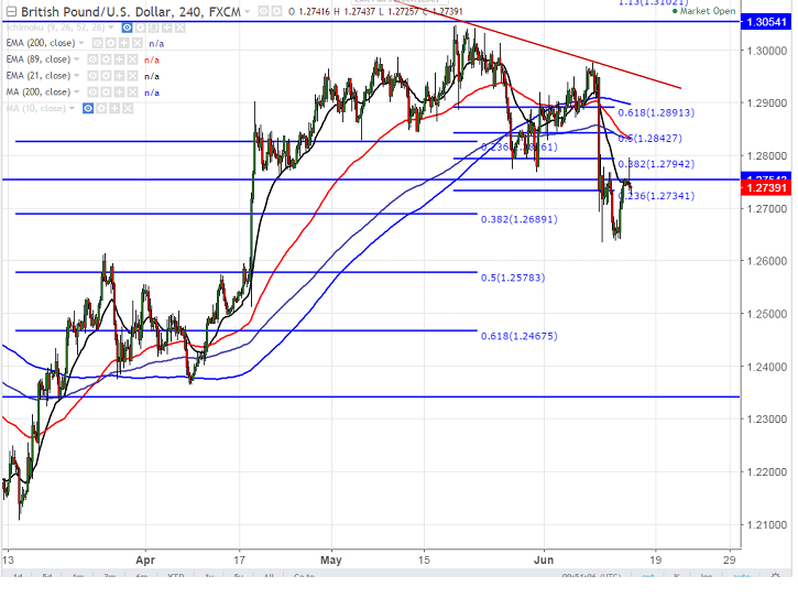 - The near term minor resistance is around 1.2780 (support turned into resistance) and any break above will take the pair till 1.2840 (50% retracement of 1.30476 and 1.26359)/1.2880 (21 EMA). The pair should break above 1.3050 for further bullish continuation.
