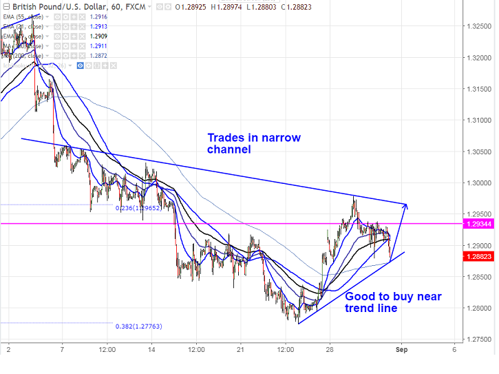- Cable is declining after forming a temporary top around 1.29785 formed on Aug 29th 2017. The pair has taken support near 89- day EMA yesterday and shown a minor jump from that level.