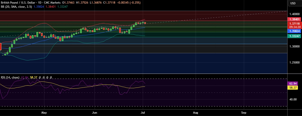 • Immediate resistance is located at 1.3791(23.6%fib), any close above will push the pair towards 1.3843(Higher BB)