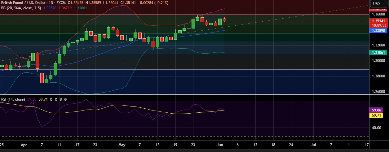 • Immediate resistance is located at 1.3605(23.6%fib), any close above will push the pair towards 1.3681( Higher BB)
