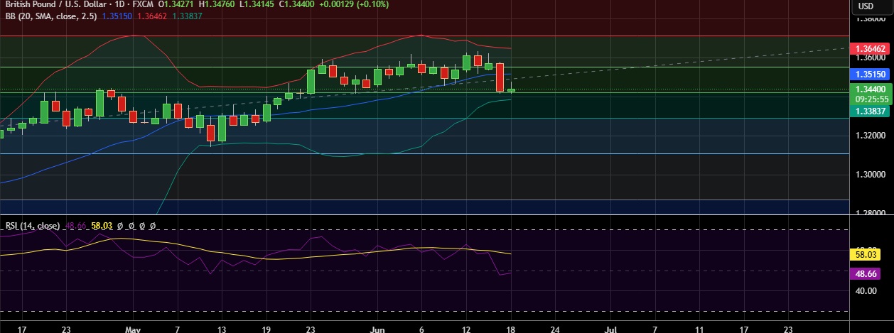 • Strong support is seen at 1.3421(50%fib) and break below could take the pair towards 1.3384(Lower BB).