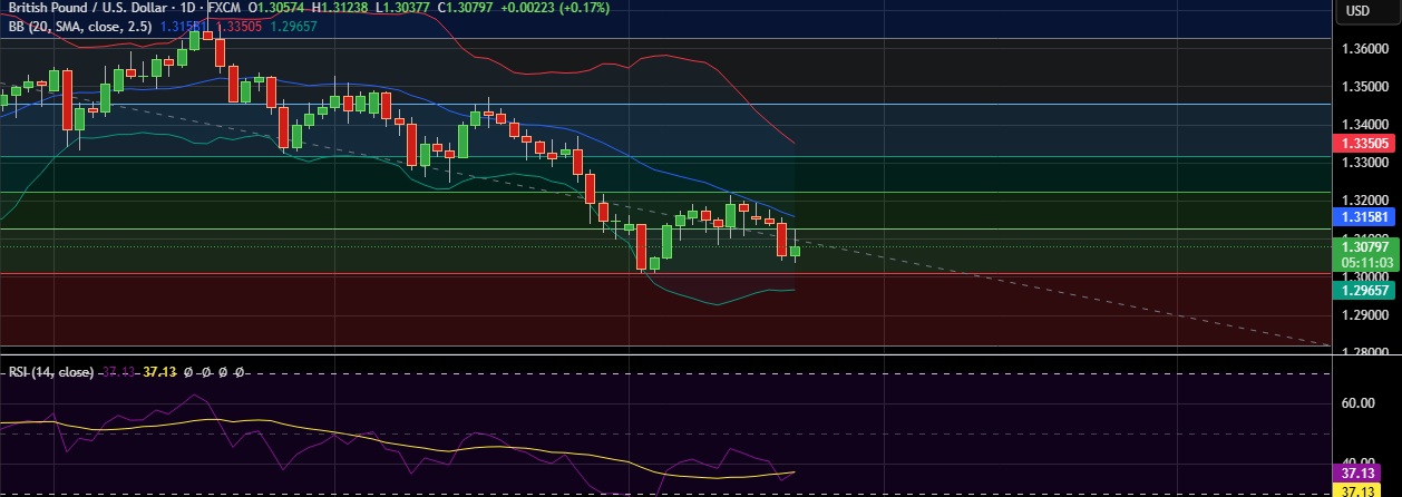 • Strong support is seen at 1.3012 (23.6%fib) and break below could take the pair towards 1.2966(Lower BB).