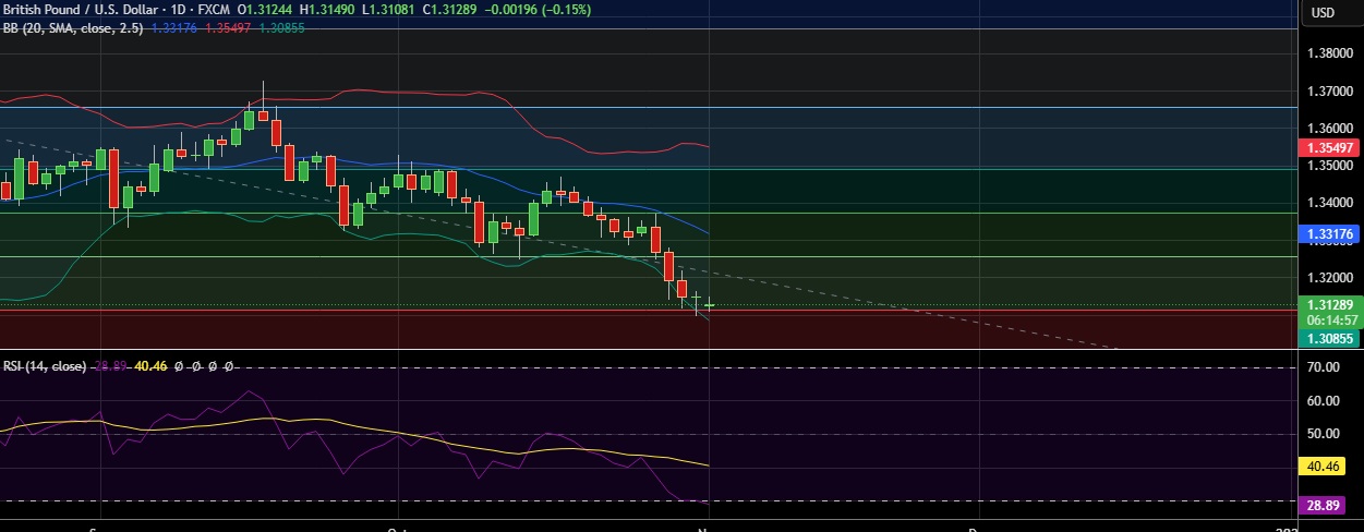 • Strong support is seen at 1.3113(23.6%fib) and break below could take the pair towards 1.3087(Lower BB).