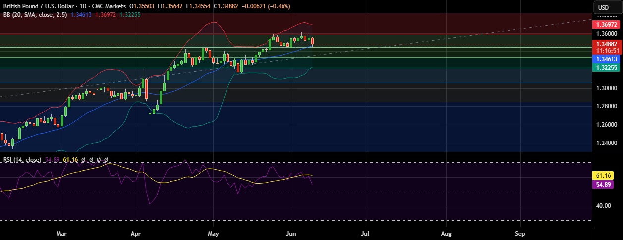 • Strong support is seen at 1.3448(38.2%fib) and break below could take the pair towards 1.3334(50%fib).