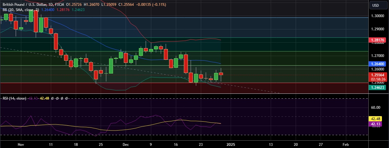 •Support is seen at 1.2496(23.6%fib) and break below could take the pair towards 1.2462(Lower BB).
