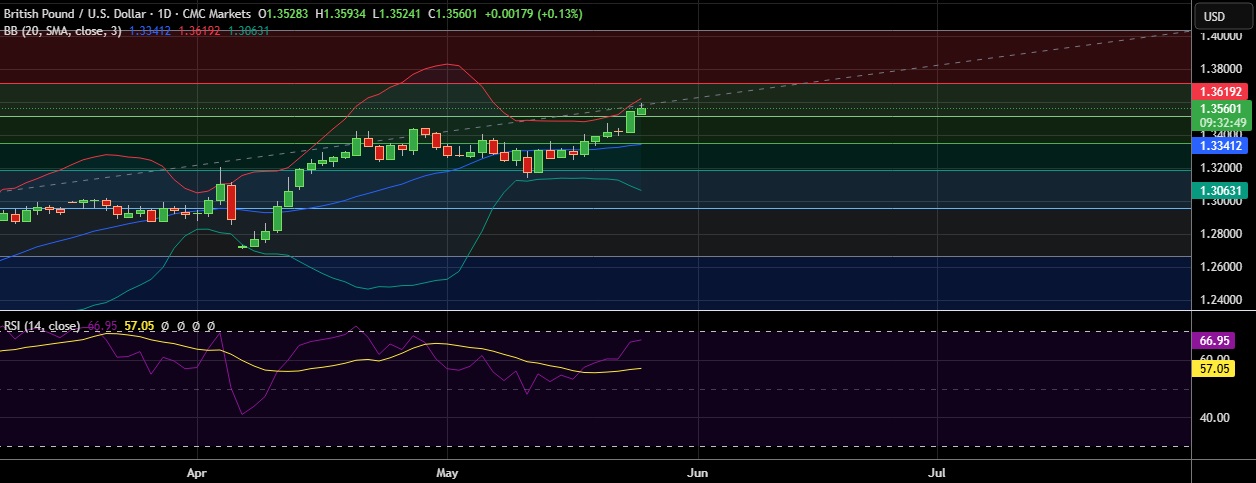 • Immediate resistance is located at 1.3617(Higher BB), any close above will push the pair towards 1.3708(23.6%fib)