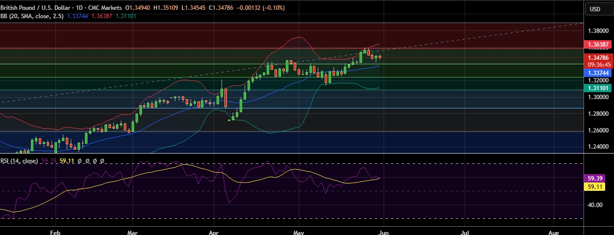 • Immediate resistance is located at 1.3588 (23.6%fib), any close above will push the pair towards 1.3645(Higher BB)
