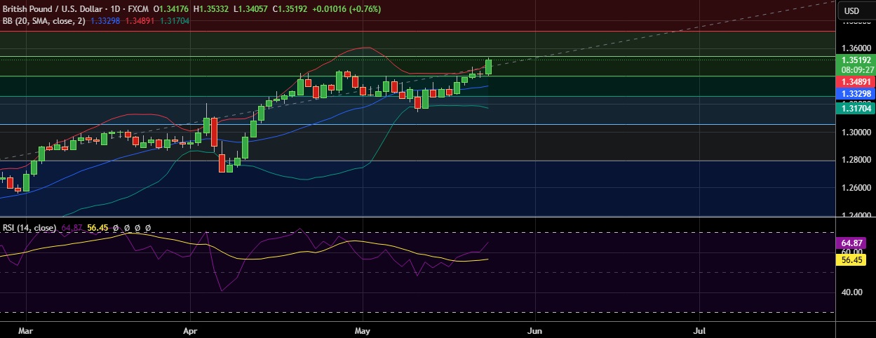 • At GMT 12:51, the pound was up 0.86% to 1.3523 against the US dollar.