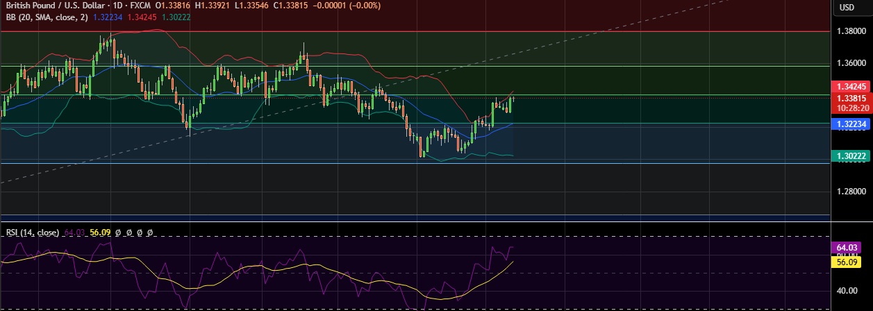 • Immediate resistance is located at 1.3403(50%fib), any close above will push the pair towards 1.3432(Higher BB)