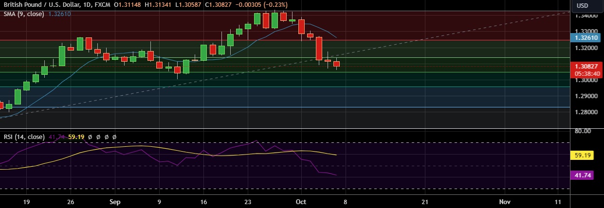 • Strong support is seen at 1.3049(50% fib) and break below could take the pair towards 1.3000(Psychological level).