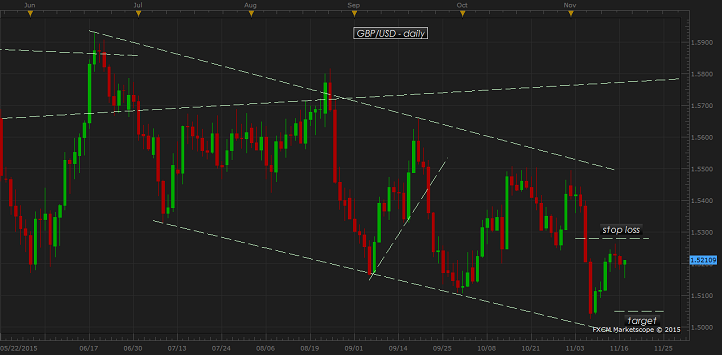 - Sell Pound against Dollar at current price (1.52), with target around 1.505 area and stop loss around 1.528. It is a good 2:1 risk reward ratio.