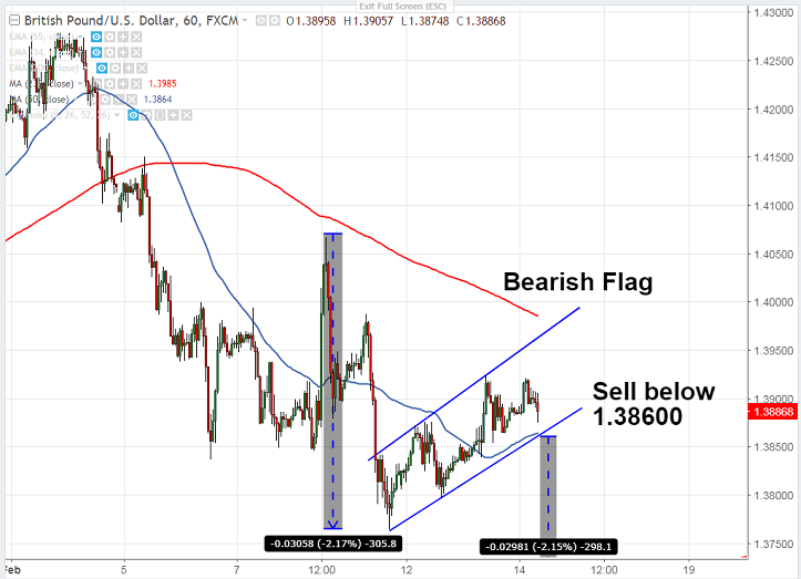 - Cable was consolidating in narrow range between 1.37600 and 1.39240 for the past five trading days. The pair has formed bearish flag pattern in the hourly chart and any break below down channel trend line will confirms minor weakness.