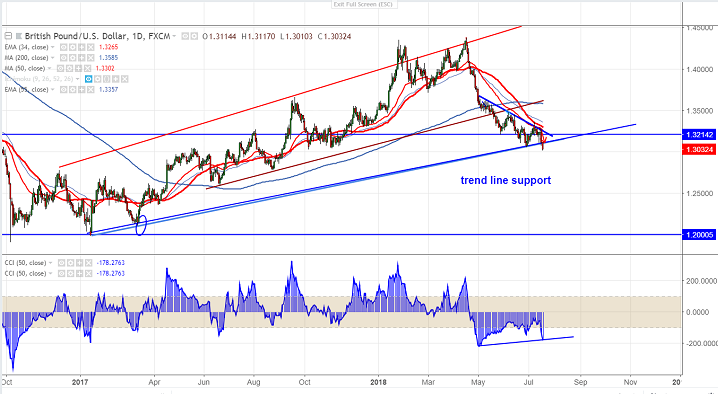 - GBP/USD has lost more than 250 pips from the high 1.32960 made on Monday on account of weak UK data and Brexit uncertainty. UK CPI Y-o-Y came at 2.4% compared to forecast 2.6% and core CPI came at 1.9% y-o-y slightly below previous month 2.1%. UK inflation m/m came at 0% compared to forecast of 0.2% vs 0.4% in the month of May.UK June jobless data released yesterday came better than expected but wage growth has fallen to lowest level in six months. The decline in wage growth could dampen expectations of an interest rate rise next month. It hits intraday low of 1.3010 and is currently trading around 1.3040.