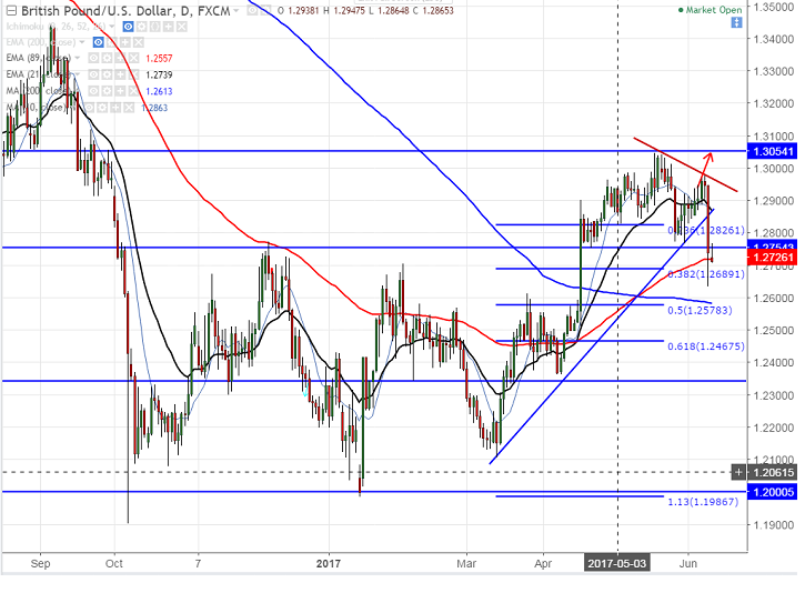 - The pair hits low of 1.26359 and shown a minor recovery from that level. The upside is capped by 1.2780 (support turned into resistance) and any break above confirms minor bullishness.