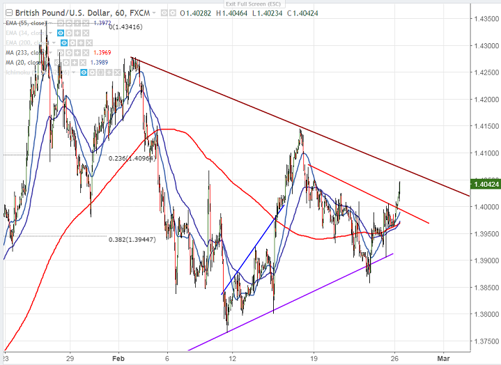 - Cable trading higher in Asian session and jumped almost 37 pips from low of 1.39640. The pair broken convincingly above 1.4000 level jumped till 1.40389. It is currently trading around 1.40307.