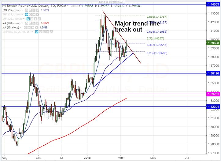 - Cable has jumped sharply yesterday almost more than 100 pips yesterday due to slight weakness in US dollar index. US dollar was trading lower against all majors yesterday after in line with estimate US CPI data and due to removal of US Secretary of State by Trump. According to Politico President Donald Trump is expected to impose package of tariffs to China almost of $30 billion. The apir hits intraday high of 1.39957 and is currently trading around 1.39621.