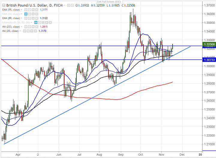 - Cable recovers sharply after forming a temporary bottom at 1.30618 after dovish rate hike. The main reason for jump in UK pound was mainly due to better than expected UK economic data. The pair has broken major resistance 1.3230 high made on Nov 10th 2017. It is currently trading around 1.32513.