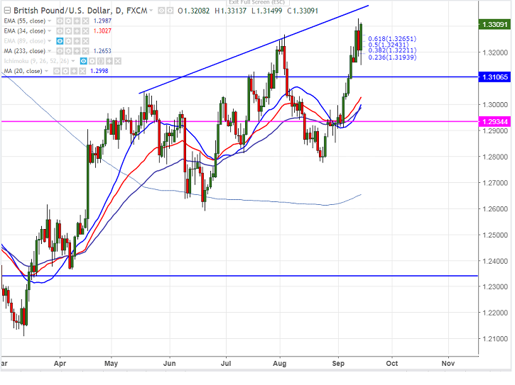 - Cable has jumped sharply after slightly hawkish stance by BOE in the meeting. The pair has jumped from the low of 1.31499 till 1.33245 at the time of writing.