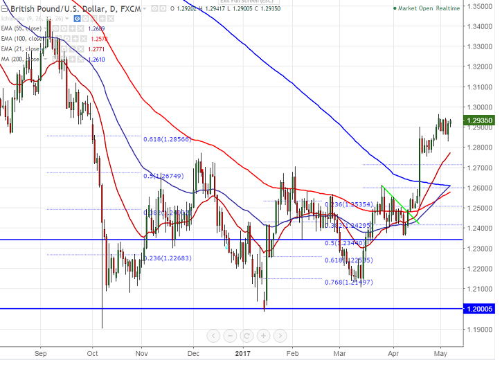 - The pair is facing major resistance around 1.29655 high made on Apr 28th 2017 and any violation above will accelerate the up move to 1.3000. A follow through buying above 1.3000 will take the pair till 1.3060/1.3090.