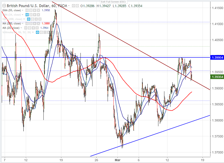 - Cable has declined almost more than 50 pips from today’s high of 1.39885 on account of increasing tensions between Russia and UK. UK-Russia tension risk has been escalated over ex-spy’s poisoning. The poisoning of an ex-Russian spy named Sergei Skripal and his daughter Yulia. The pair hits intraday low of 1.39215 and is currently trading around 1.39420.