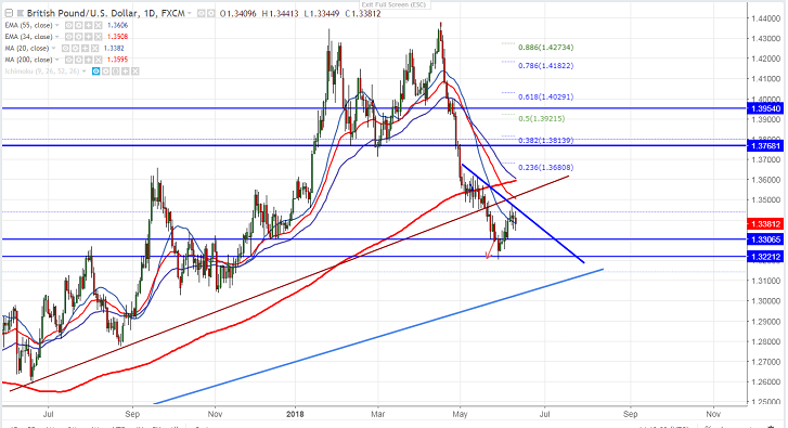 - The pair recovered sharply from low of 1.32043 made on May 29th 2018 and jumped nearly 200 pips from its low. The near term resistance is around 1.3390 (20- day MA) any break above will take the pair to next level till 1.3460 (trend line resistance)/ 1.3516 (34- day EMA)/1.3590. Short term trend is still weak as long as resistance 1.3620 holds. Any break above 1.3620 will take the pair till 1.3680/1.3760.