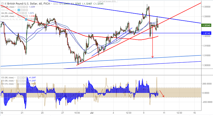 - GBP/USD has halted its bullishness after hitting 2 week high yesterday. The pair declined sharply after showing a minor jump above 50- day MA. GBPUSD had recovered sharply after resignation of David Davis Brexit Secretary as sign that a “softer” Brexit more likely. But heavy slide of more than 150 pips on the news that Foreign Secretary Boris Johnson would also be resigning. UK GDP data came at 0.3% as expected but manufacturing production came at 0.4% compared to forecast of 1.0%. The pair hits low of 1.31896 yesterday and shown a minor recovery. It is currently trading around 1.32541.
