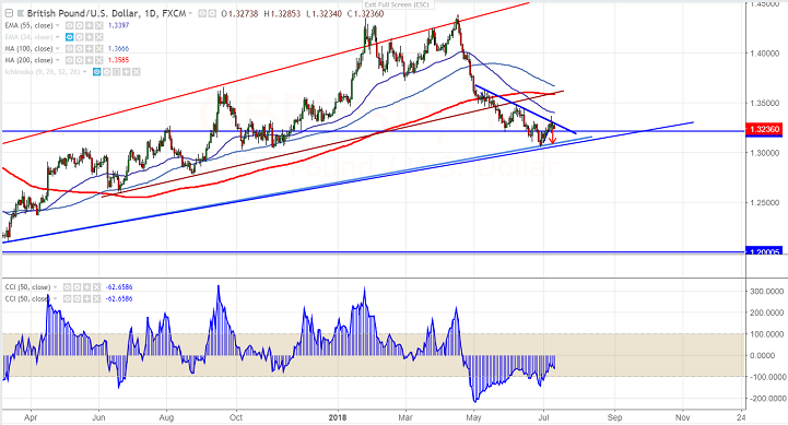 - GBP/USD has halted its bullishness after hitting 2 week high at 1.33625. The pair declined sharply after showing a minor jump above 50- day MA. The renewed political uncertainty is weighing on Pound. UK Foreign Secretary Boris Johnson resigned 15 hours after resignation of David Davis Brexit Secretary. According CFTC commitment of traders GBP has added more number of shorts +7300 contracts to 28.780 on account of political turmoil.UK GDP data came at 0.3% as expected but manufacturing production came at 0.4% compared to forecast of 1.0%. BOE is expected to hike rates in Aug but Brexit is the major problem which is dragging GBP prices down.BOE governor Mark Carneyis scheduled to speak about the global financial crisis at the National Bureau of Economic Research. The pair hits intraday high of 1.32853 at the time of writing and is currently trading around 1.32365.