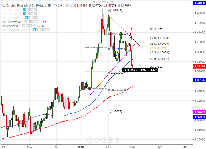 - Cable declined sharply yesterday almost 165 pips yesterday from the high of 1.39159. The pair continuing its weakness for fourth consecutive days and hits intraday low of 1.37272 and is currently trading around 1.37496.