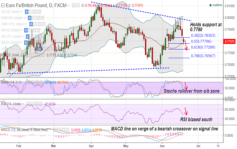 - Technicals support downside in the pair. Stochs have rolled over from overbought territory and RSI is biased south. Pair slips below 50-DMA at 0.7820.