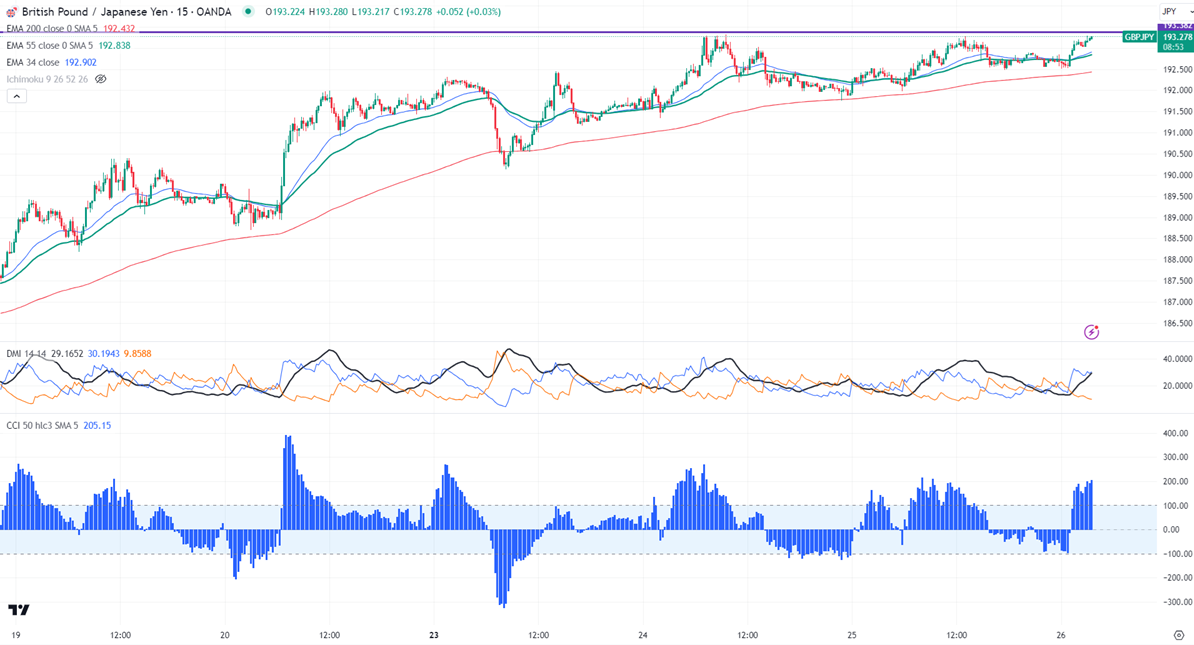 The pair is trading above short-term 34,55 EMA (190.23 and 191.72) and long-term 200 EMA (191.51) in the 15-minute chart.