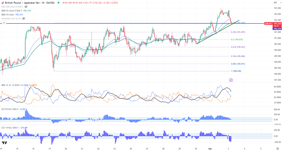 GBPJPY pared some of its gains due to profit booking. It hit a low of 192.29 at the time of writing and is currently trading around 192.20.