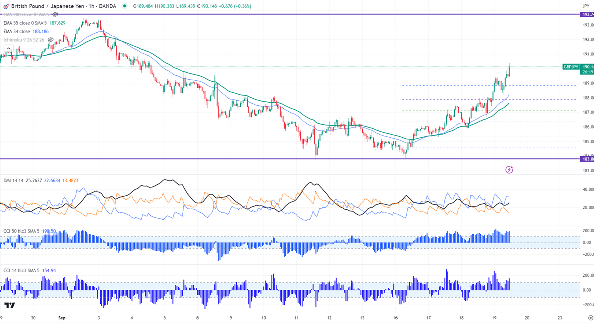The pair is trading above short-term 34, below 55 EMA (187.19 and 186.88), and long-term 200 EMA (189.81) in the 4-hour chart.