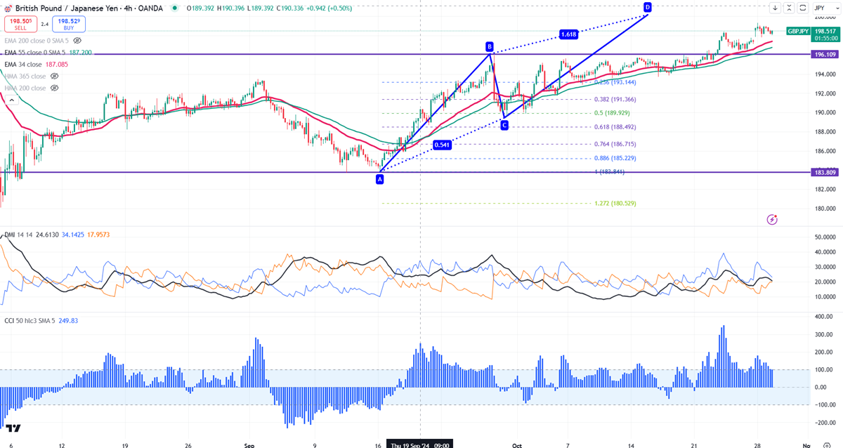 The GBP/JPY showed a minor sell-off due to the strong yen. It hit a low of 197.80 yesterday and is currently trading around 198.43 The Potential Reversal Zone (PRZ) is identified at 200.20, and the pair has gained over 800 pips this month.