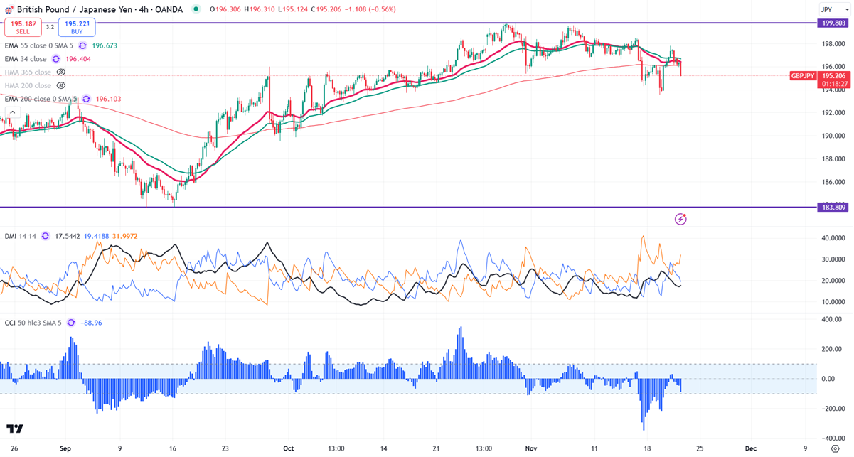 The GBP/JPY currency pair pared most of its gains on strong yen. It hits a low of195.60 at the time of writing and is currently trading around 195.88. The Potential Reversal Zone (PRZ) is set at 200.20.