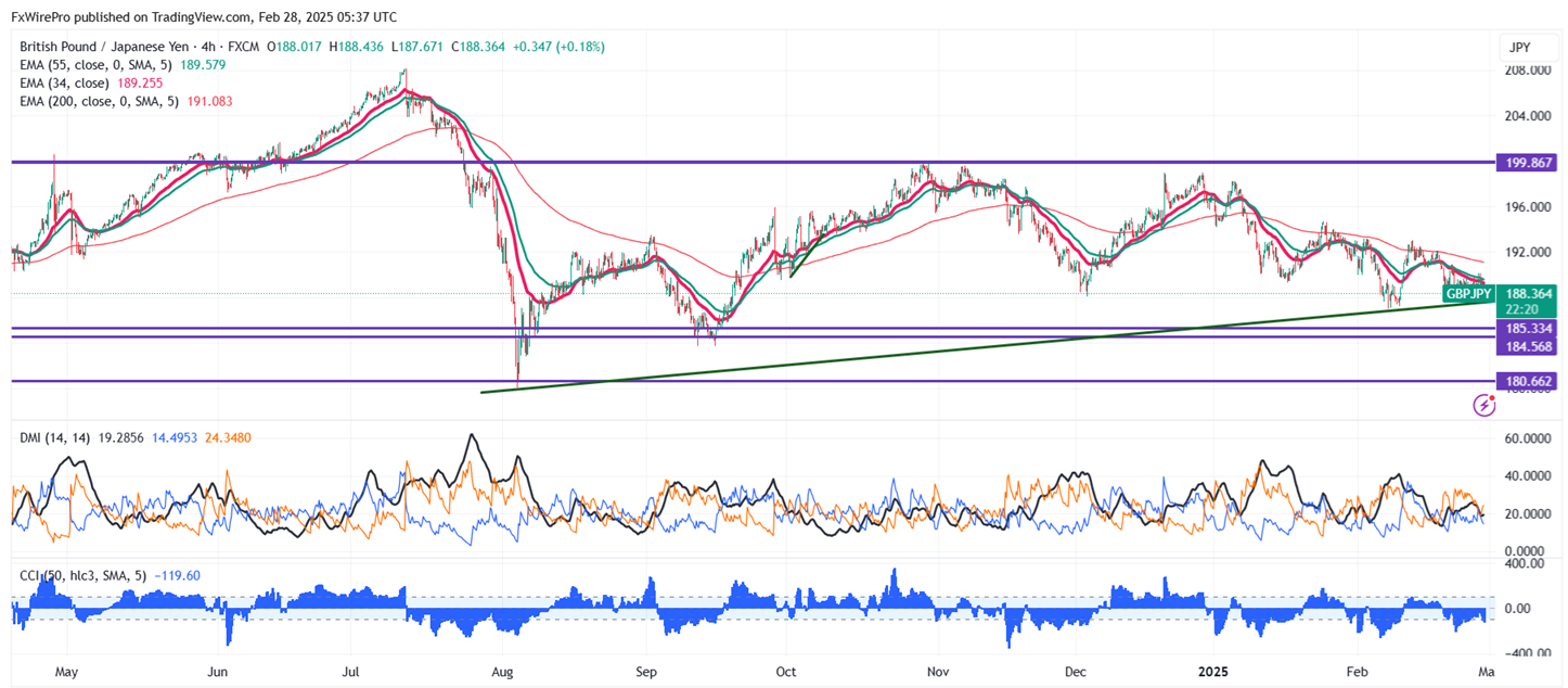 The GBP/JPY pair is trading below 34 and 55 EMA (Short-term) and 200 EMA (long-term on the 4-hour chart, confirming a bearish trend. Immediate resistance is at 189, a breach above this level targets 189.65/190/190.64/191/192. Any close above 192 in the 4-hour chart confirms further bullishness. Downside support is at 188 with additional levels at 187.65/187.25/186/185.