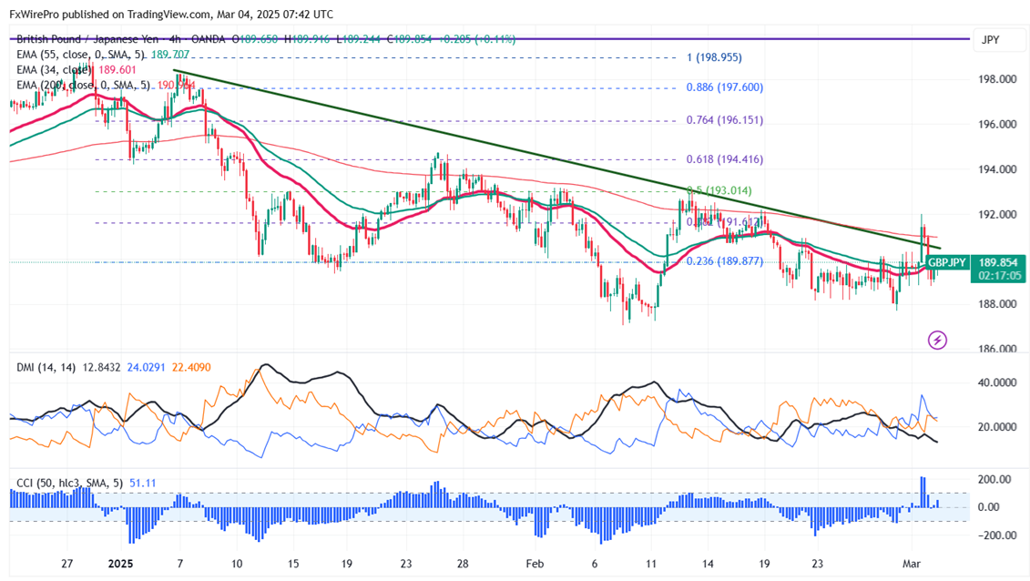 The GBP/JPY pair is trading below 34 and 55 EMA (Short-term) and 200 EMA (long-term on the 4-hour chart, confirming a bearish trend. Immediate resistance is at 190.35, a breach above this level targets of 190.64/191/192. Any close above 192 in the 4-hour chart confirms further bullishness. Downside support is at 188 with additional levels at 187.65/187.25/186/185.