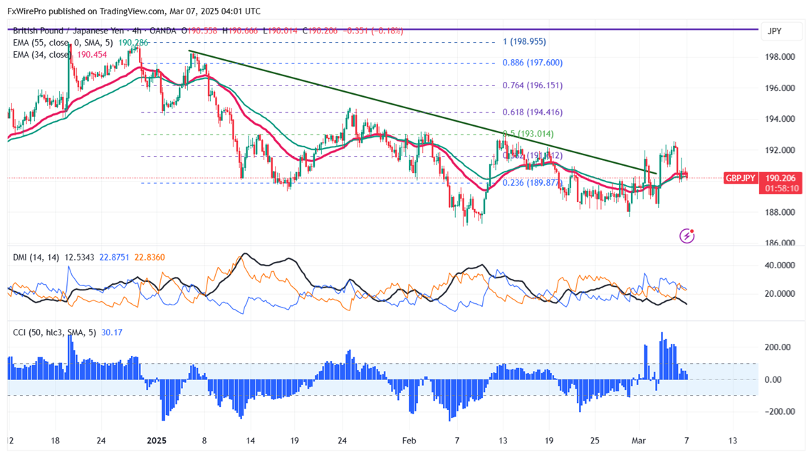 The GBP/JPY pair is trading above 34 and 55 EMA (Short-term) and 200 EMA (long-term on the 4-hour chart, confirming a bullish trend. Immediate resistance is at 191, a breach above this level targets of 192/192.60/193/195/196. Any close above 192 in the 4-hour chart confirms further bullishness. Downside support is at 189.80 with additional levels at 188.75/188/187.25/186/185.