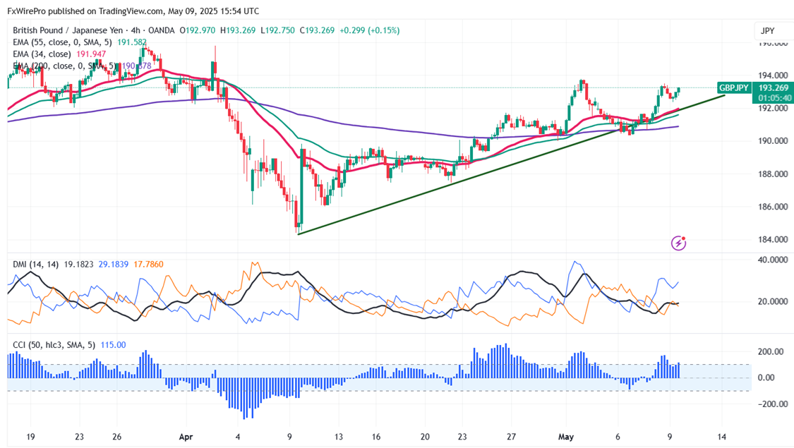 The GBP/JPY pair is trading above 34 and 55 EMA (Short-term) and 200 EMA (long-term on the 4-hour chart, confirming a bullish trend. Immediate resistance is at 193.50, a breach above this level targets 194/195. Downside support is at 192.35 191.70/190.95/190.40/190/189.30/188.