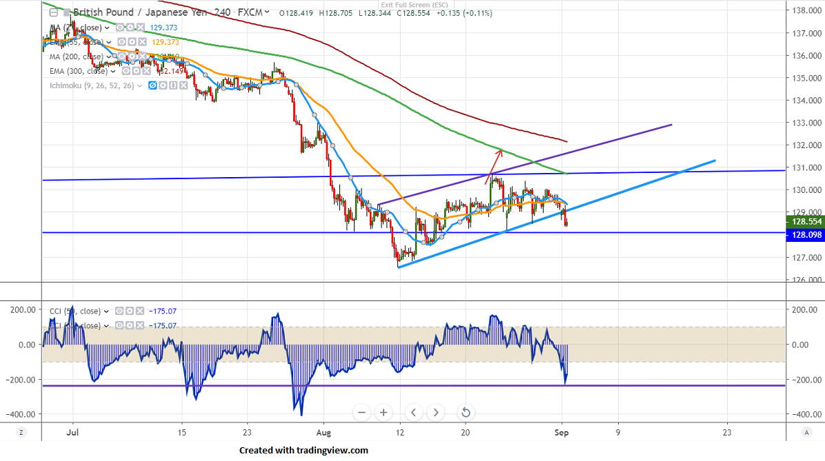 GBPJPY is trading lower and lost more than 80 pips till 128.34 from an intraday high of 129.31. It was mainly due to weak pound sterling, especially against USD. The pair declined more than 200 pips from the temporary top 1.23099 on Brexit wobble. UK manufacturing PMI came at a 7-year low at 47.5 compared to 49.5.
