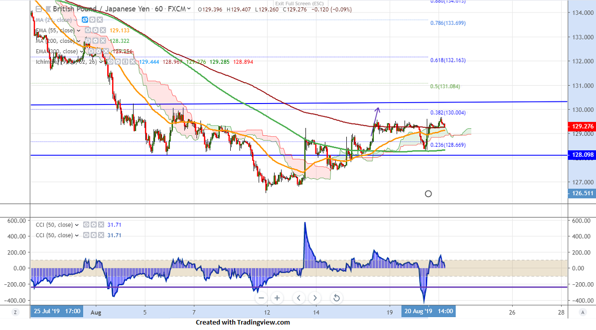 GBPJPY has once again recovered sharply after hitting a low of 128.26. The pair is holding above 200-H MA for the past four trading days and hits 5- day high of 129.67 yesterday and is currently trading around 129.31.