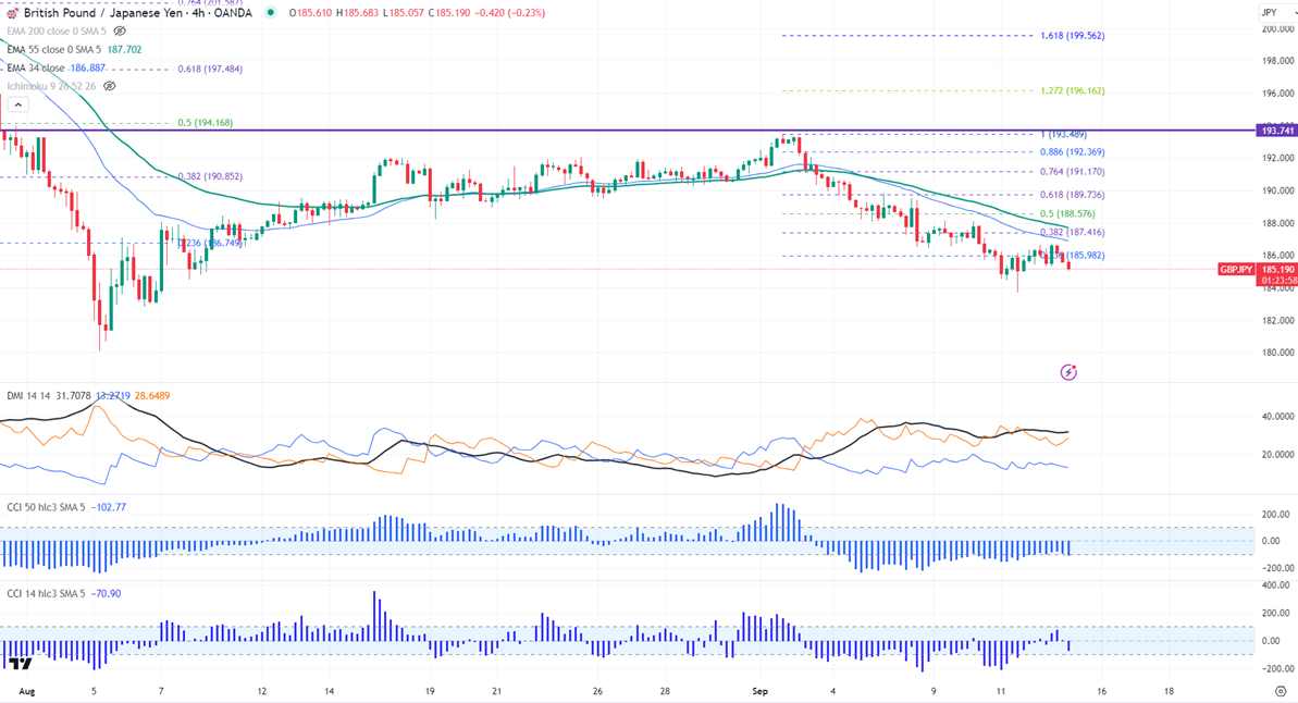 The pair is trading below short-term 34, below 55 EMA (186.99 and 187.79), and long-term 200 EMA (190.78) in the 4-hour chart.