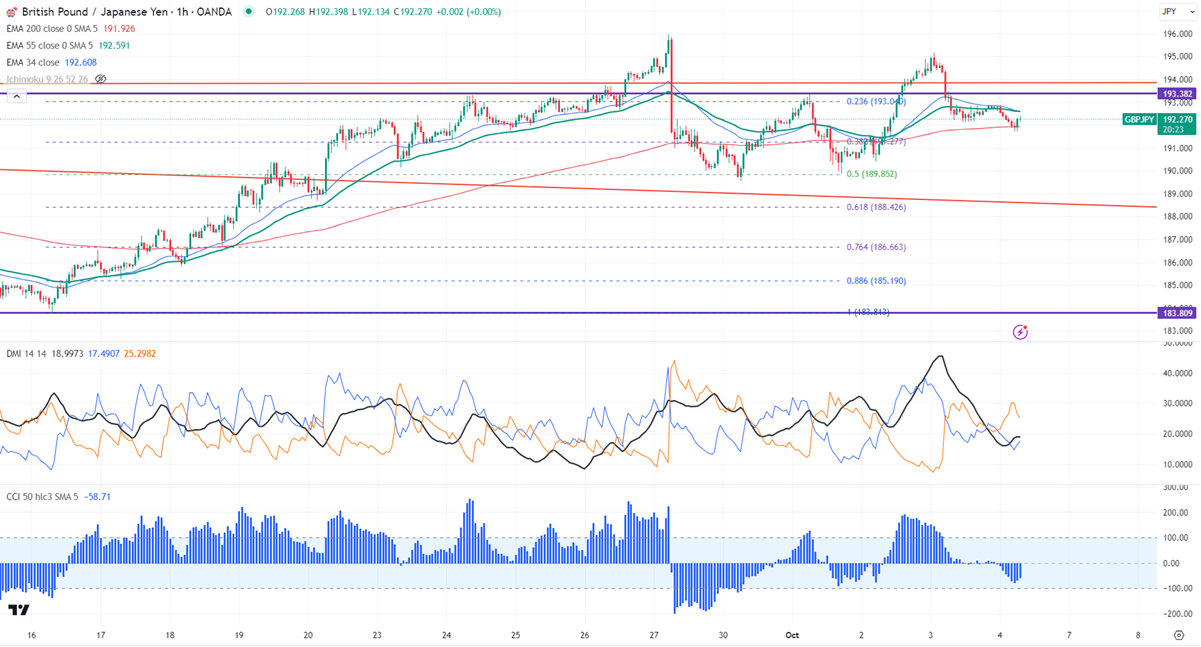 The pair is trading below short term 34,above 55 EMA (192.629 and 192.603) and long term 200 EMA (191.90) in the hourly chart.
