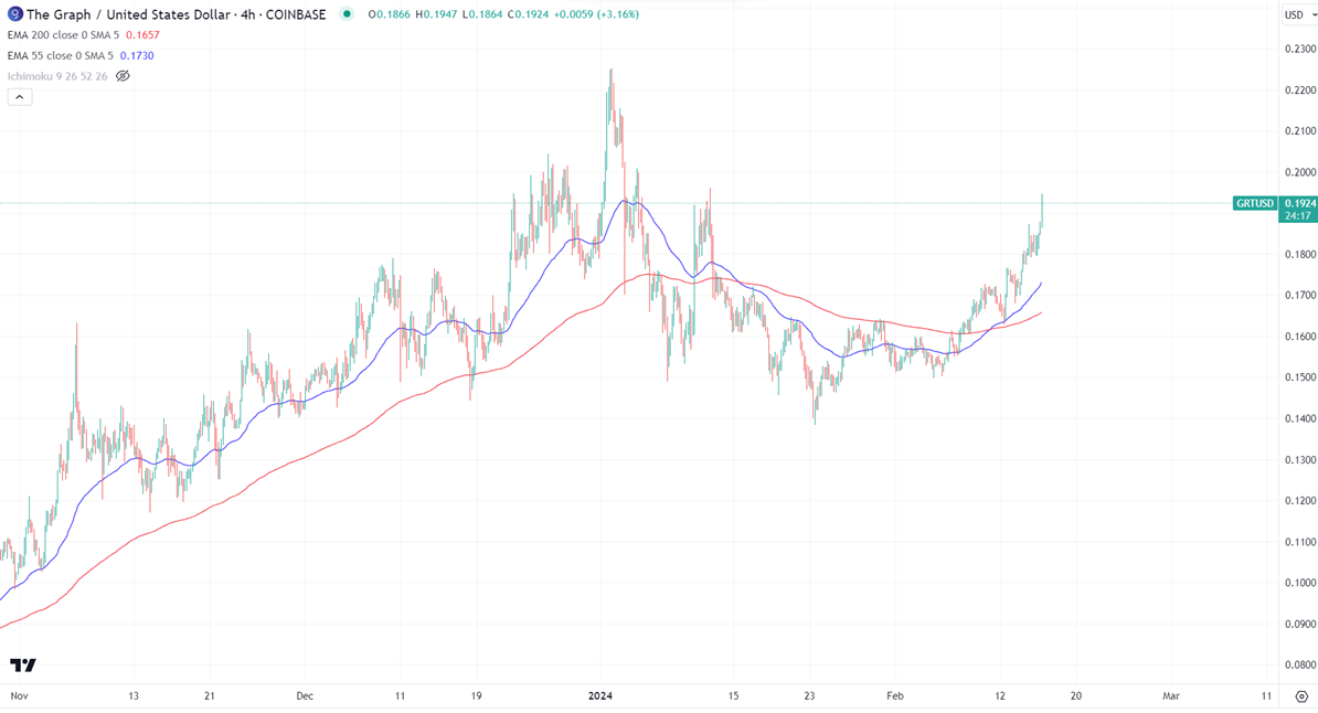 GRTUSD gained more than 40% in the past six weeks. The pair holds well above the short-term (21 and 55 EMA) and long-term moving average. It hit a high of $0.1950 and is currently trading around $0.1934.