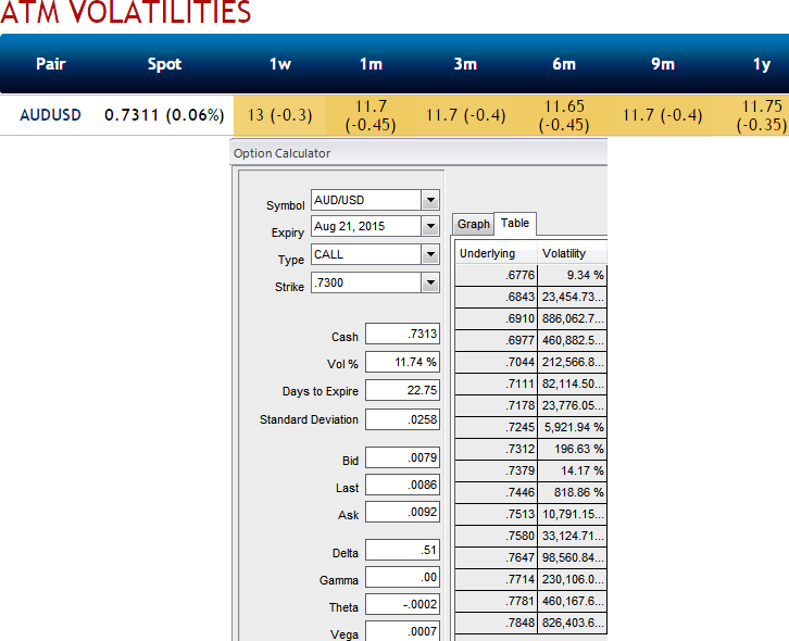 As the risk appetite varies from different investors to different traders, we've customized our formulation of strategies for such varied circumstances. Prevailing implied volatility rates for AUD/USD ATM 1M contracts is 13% and 11.74% for 1W contracts.