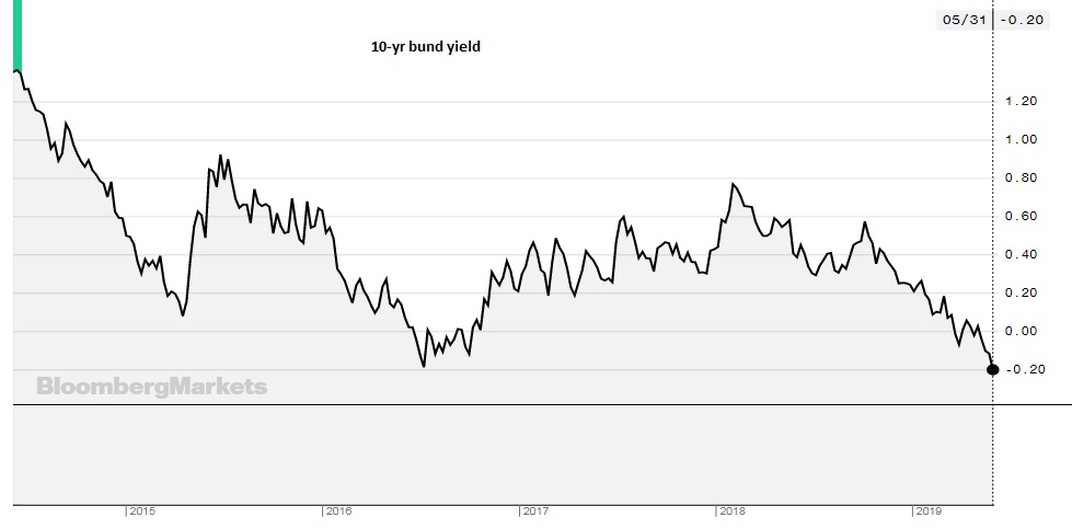 Amid risk aversion stemming from Sino-American trade dispute, where both parties have engaged in a tariff battle, German 10-year bund price has reached a fresh record high, while yields dropped to a record low. The 10-yr bund future is currently trading at 168.4 area, while the 10-yr yield has dropped to a new low of -0.23 percent, surpassing the previous bottom of -0.19 percent made in 2016. German 30-yr yield is at 41 bps, just shy of a record low of 34 bps.